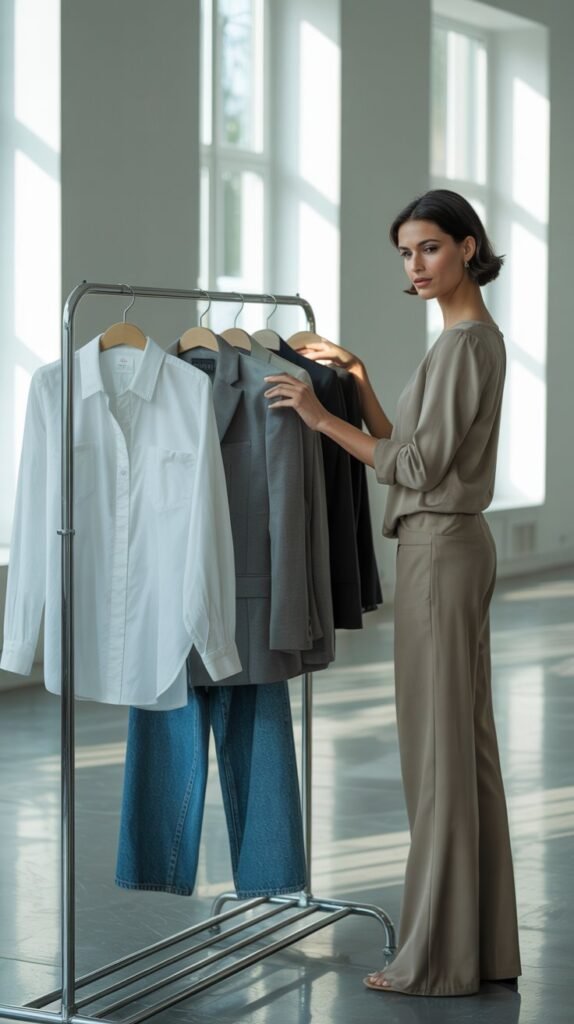 Start with classic basics that never go out of style. A crisp white button-down instantly elevates jeans, trousers, or skirts, while a high-quality cotton tee provides the perfect minimalist base for layering under blazers, cardigans, or lightweight sweaters.