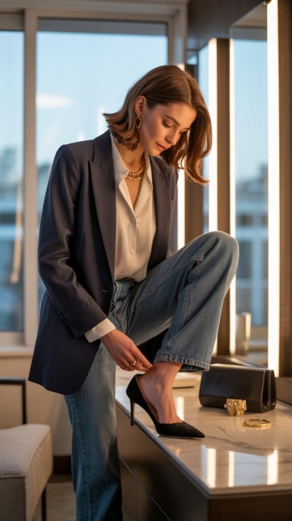 Next, include premium denim in your capsule. A dark-wash straight-leg or slim-cut jean offers unmatched versatility — casual enough for errands, yet sleek enough for dinner.