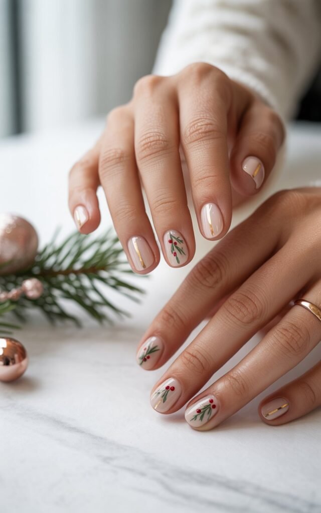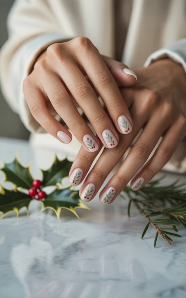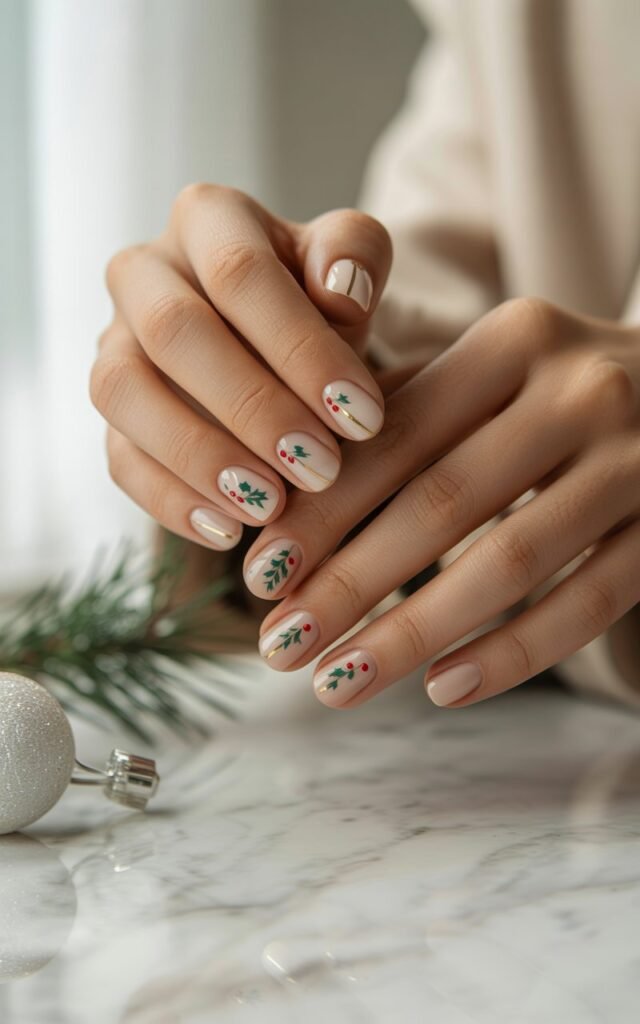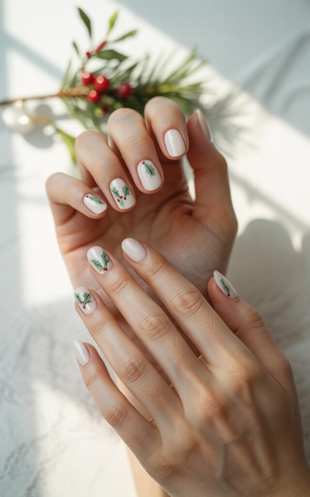 This minimal holly nail design is simple yet elegant, perfect for adding a festive touch to your look without being overly complicated.