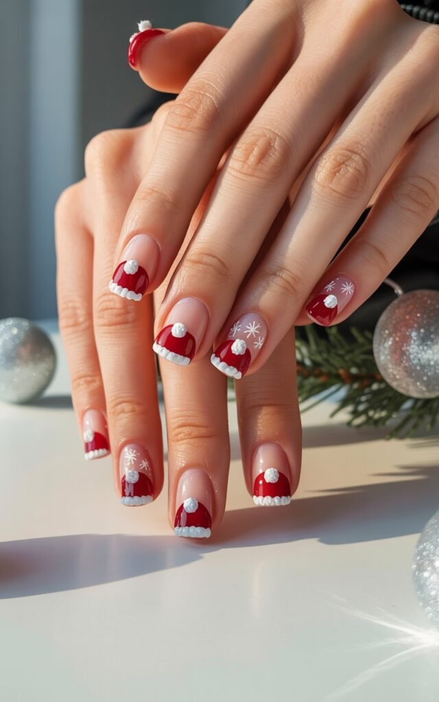 The final design combines a classic French manicure with a fun Santa hat twist.