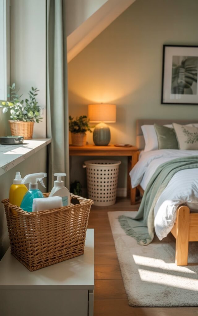 Leave cleaning supplies in easy-to-reach places — a small spray bottle and cloth in the bathroom, wipes in the living room, a basket in each room for quick pickups.