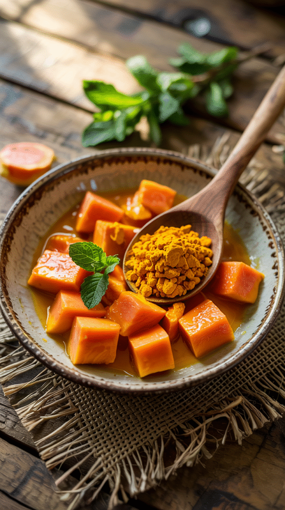 • Blend a few cubes of raw papaya with ½ teaspoon turmeric.