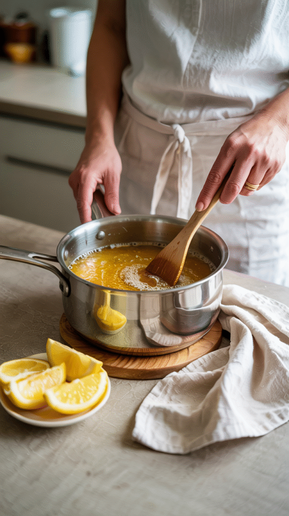 • Heat 2 tablespoons of sugar with 1 tablespoon of lemon juice and a little water until it forms a thick syrup.