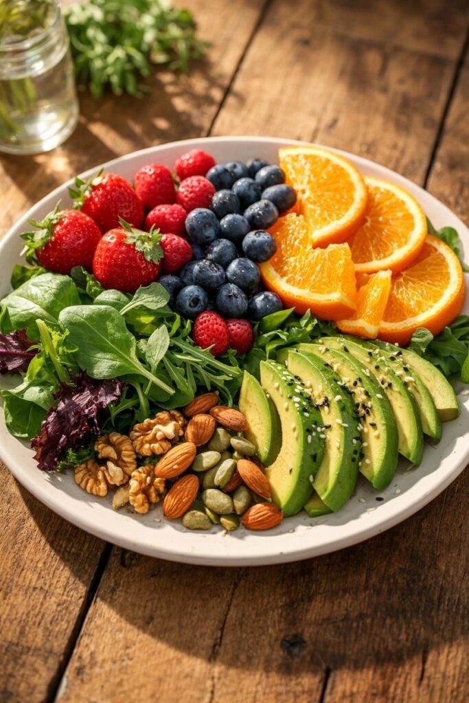 For example, fruits like berries and oranges provide vitamin C, which helps the skin look brighter and more refreshed.