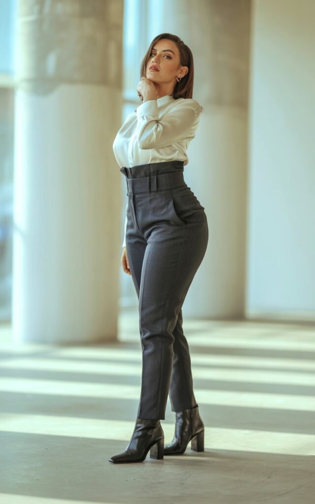 High-waisted pants are a must-have in every petite curvy woman’s wardrobe.