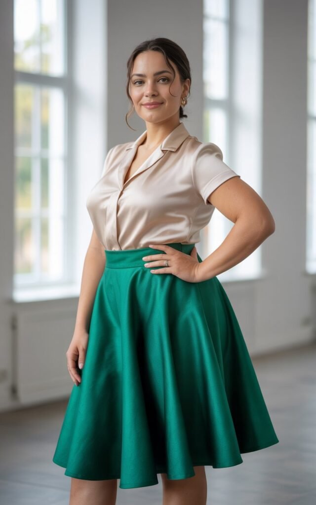A-line skirts are a staple for petite curvy women because they flare gently from the waist, creating balance between the hips and upper body.