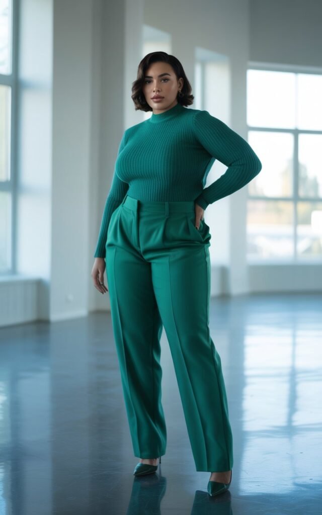 Wearing one color from head to toe creates a continuous vertical line, which visually elongates petite frames and balances curves.