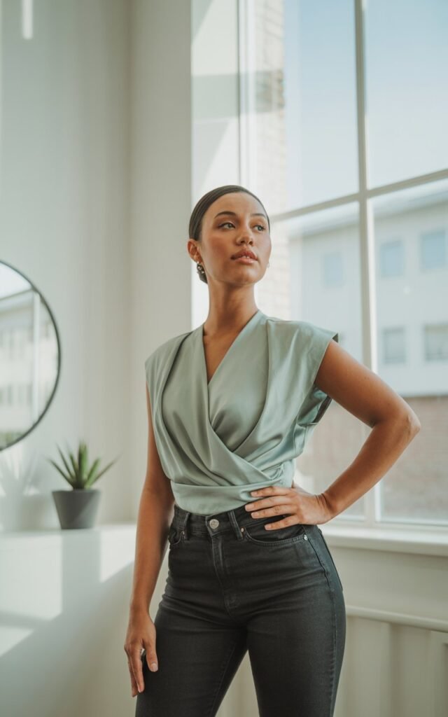 - Necklines: Choose open necklines like V-necks, scoop necks, or soft cowl necks. These draw the eye upward and elongate your neck area. Avoid high necks or turtlenecks that make the upper body look heavier.