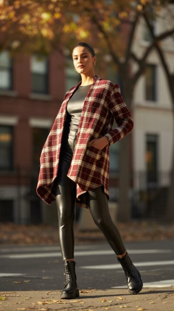 Shackets are having a major moment. Pair a plaid shacket with black leggings and lace-up combat boots for an effortlessly cool, casual winter look.