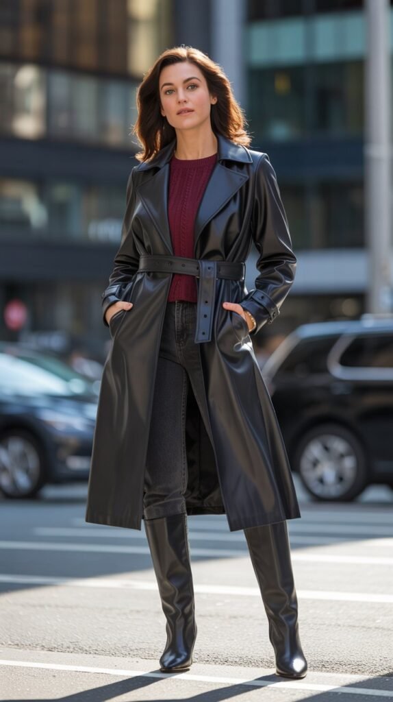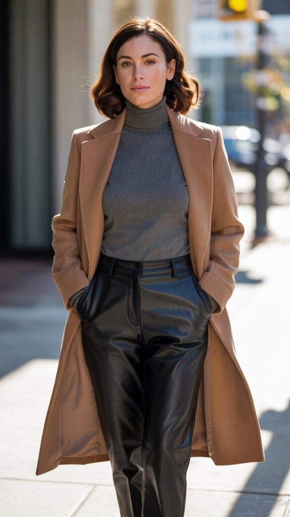 Camel coats never go out of style. Pairing them with a sleek black turtleneck and leather pants gives you a chic, city-ready vibe.