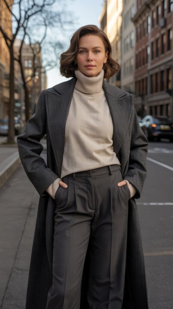 Focus on quality fabrics (like wool, cashmere, and structured knits), clean tailoring, and neutral tones.