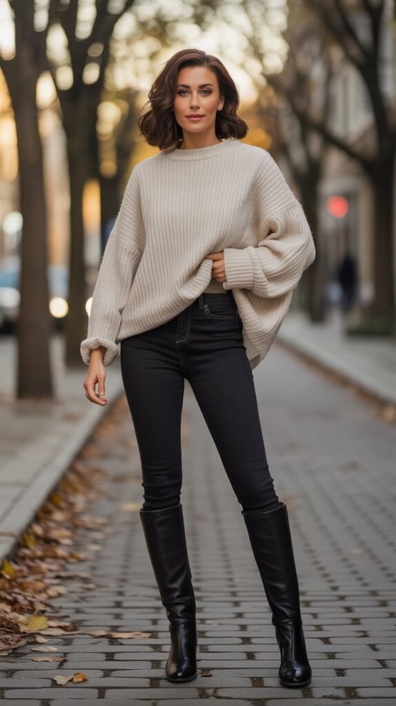 1. Oversized Sweater + Skinny Jeans + Knee-High Boots